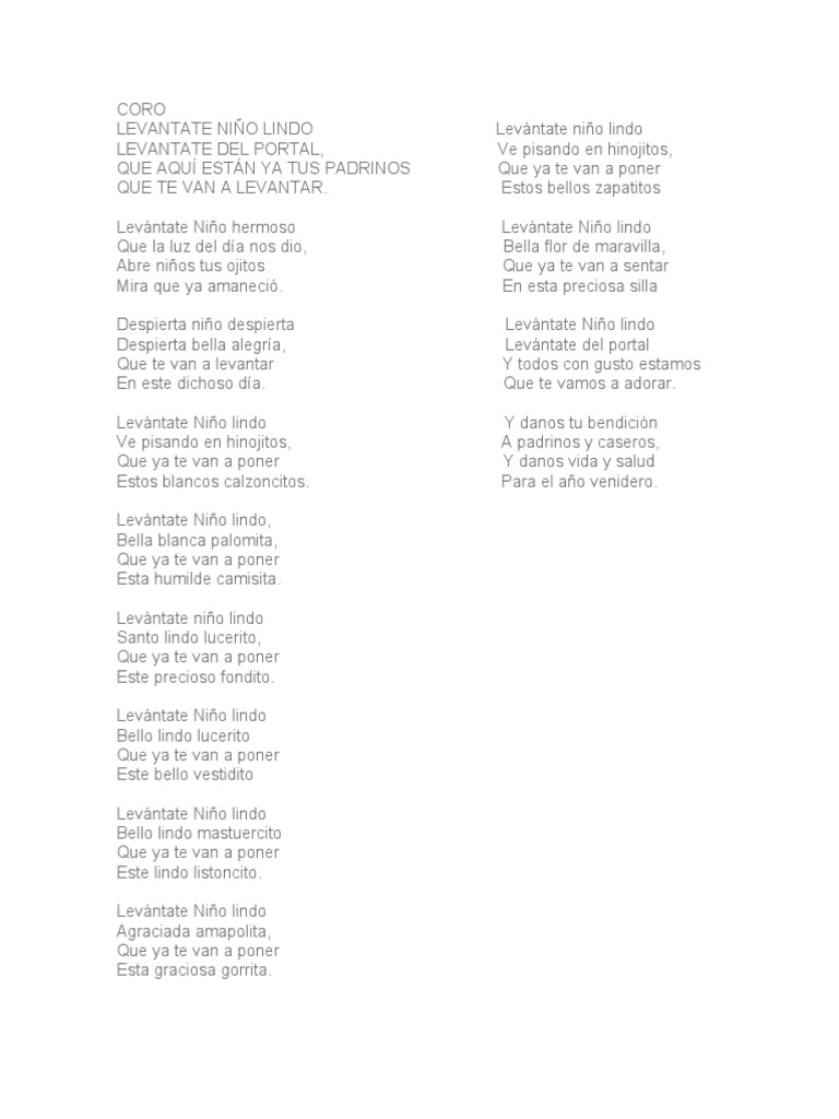 Cancion Del Arrorro Mi Nino Dios Letra Varios Ninos - .levantate nino lindo, levantate del porta, que aqui estan ya tus padrinos, que te van a levantar.